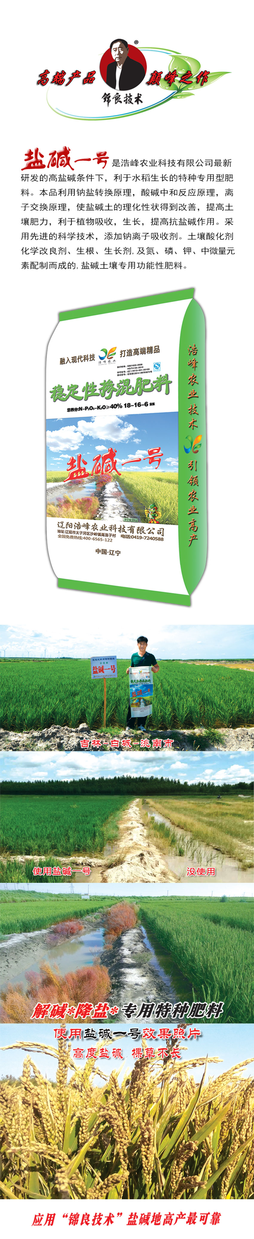 鹽堿一號(hào)是浩峰農(nóng)業(yè)科技有限公司最新研發(fā)的高鹽堿條件下,利于水稻生長(zhǎng)的特種專用型肥料。本品利用鈉鹽轉(zhuǎn)換原理,酸堿中和反應(yīng)原理,離子交換原理,使鹽堿土的理化性狀得到改善,提高土壤肥力,利于植物吸收,生長(zhǎng),提高抗鹽堿作用。采用先進(jìn)的科學(xué)技術(shù),添加鈉離子吸痢M寥浪嶧粱Ц牧技?、生根、生长?,及氮、磷、鉀、中微量元素配制而成的,鹽堿土壤專用功能性肥料。