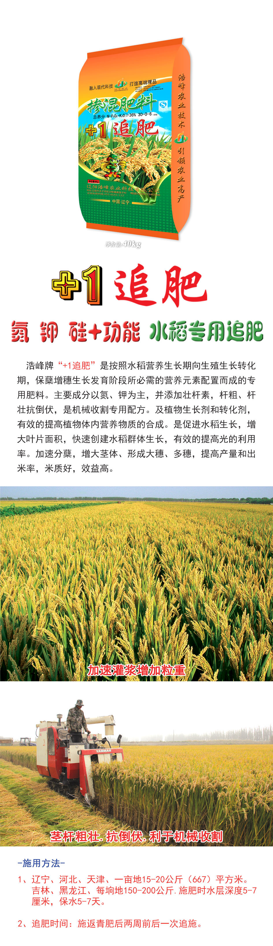 浩峰牌“+1追肥”是按照水稻營養(yǎng)生長期向生殖生長轉(zhuǎn)化期,保蘗增穗生長發(fā)育階段所必需的營養(yǎng)元素配置而成的專用肥料。主要成分以氮、鉀為主,并添加壯桿素,桿粗、桿壯抗倒伏,是機械收割專用配方。及植物生長劑和轉(zhuǎn)化劑,有效的提高植物體內(nèi)營養(yǎng)物質(zhì)ず銑傘J譴俳舊ぃ齟笠鍍婊?,繝F俅唇ㄋ救禾逕?,有效的提高光的利用率。尖欃分蘖,札e缶ヌ濉⑿緯紗笏?、多穗,提高产量航y(tǒng)雒茁剩字屎?,效益高?