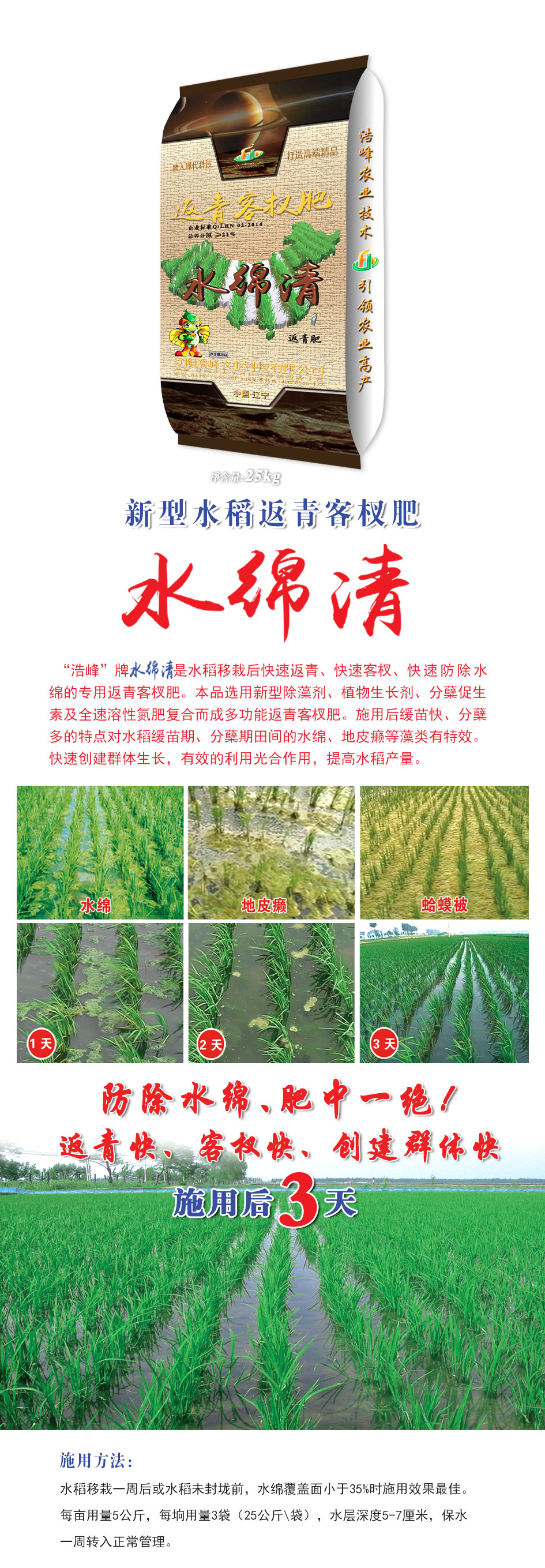 “浩峰”牌 是水稻移栽后快速返青、快速客杈、快速防除水綿的專用返青客杈肥。本品選用新型除藻劑、植物生長劑、分蘗促生素及全速溶性氮肥復(fù)合而成多功能返青客杈肥。施用后緩苗快、分蘗多的特點對水稻緩苗期、分蘗期田間的水綿、地皮癩等藻類有特效??焖賱?chuàng)建群體生長,有效的利用光合作用,提高水稻產(chǎn)量。