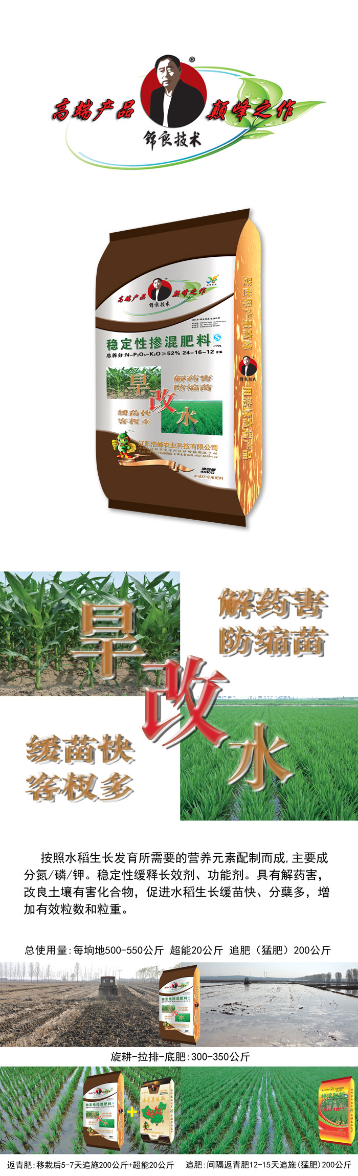 按照水稻生長發育所需要的營養元素配制而成,主要成分氮/磷/鉀。穩定性緩釋長效劑、功能劑。具有解藥害,改良土壤有害化合物,促進水稻生長緩苗快、分蘗多,增加有效粒數和粒重。