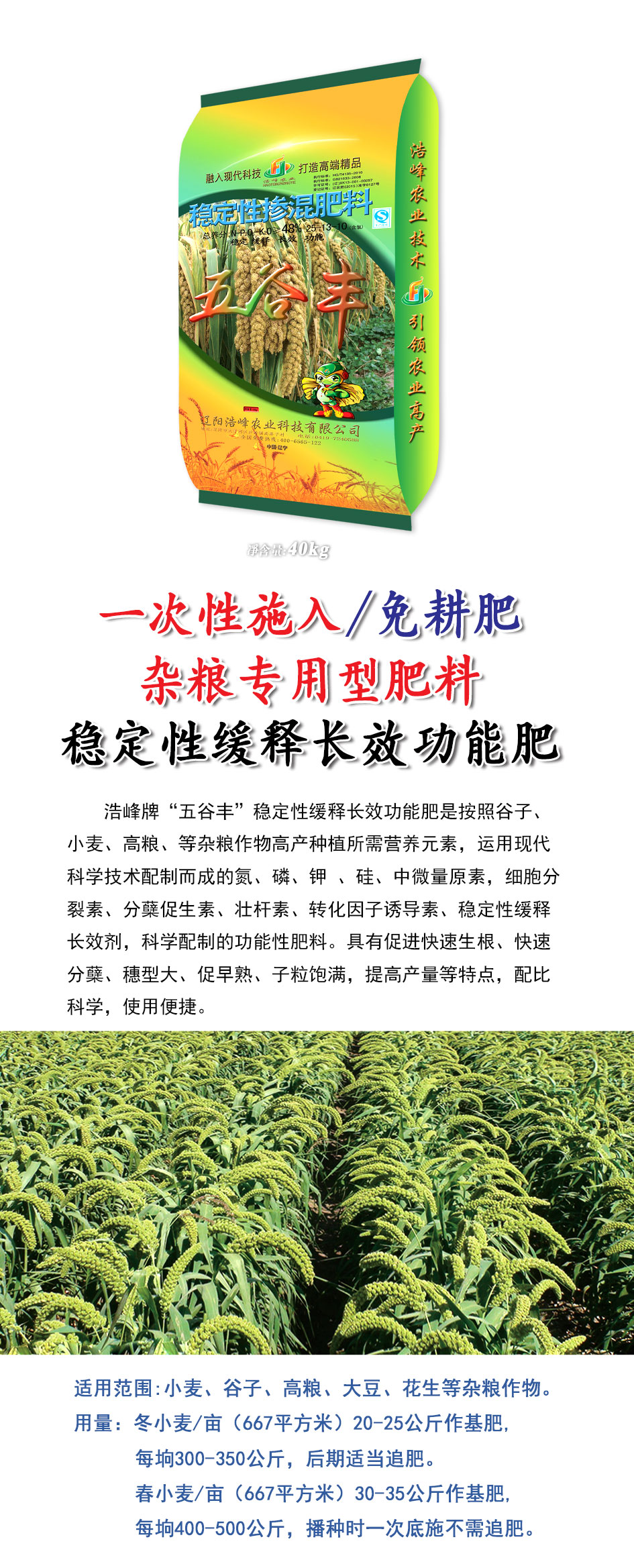 浩峰牌“五谷豐”穩(wěn)定性緩釋長(zhǎng)效功能肥是按照谷子、小麥、高糧、等雜糧作物高產(chǎn)種植所需營養(yǎng)元素,運(yùn)用現(xiàn)代科學(xué)技術(shù)配制而成的氮、磷、鉀 、硅、中微量原素,細(xì)胞分裂素、分蘗促生素、壯桿素、轉(zhuǎn)化因子誘導(dǎo)素、穩(wěn)定性緩釋長(zhǎng)效劑,科學(xué)配制的功能性肥料。具有促進(jìn)快速生根、快速分蘗、穗型大、促早熟、子粒飽滿,提高產(chǎn)量等特點(diǎn),配比科學(xué),使用便捷。