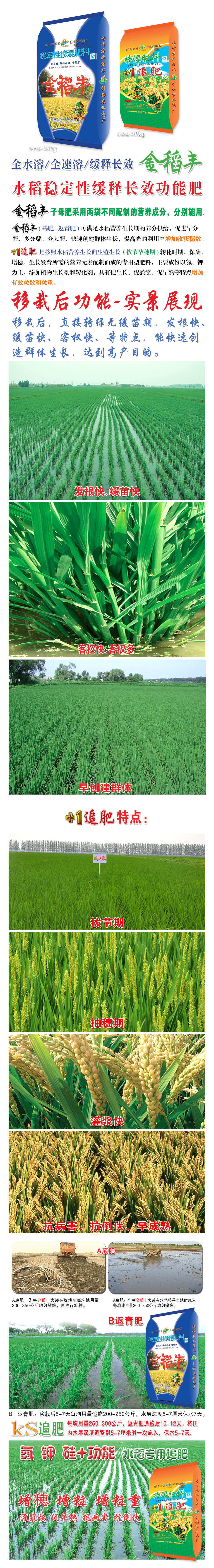 金稻豐子母肥采用兩袋不同配制的營養(yǎng)成分,分別施用。金稻豐(基肥.返青肥)可滿足水稻營養(yǎng)生長期的養(yǎng)分供給,促進(jìn)早分蘗、多分蘗、分大蘗、快速創(chuàng)建群體生長,提高光的利用率增加收獲穗數(shù)。+1追肥是按照水稻營養(yǎng)生長向生殖生長(拔節(jié)孕穗期)轉(zhuǎn)化時(shí)期,保蘗、增穗、生⒂璧撓嘏渲貧傻淖ㄓ瞇頭柿?,主要成份揖壀、钾为嘱崿添加謪㈠婜长剂和转化剂,具訉戀生长、促灌浆、促钥r斕忍氐閽黽佑行ЯJ土V亍?
